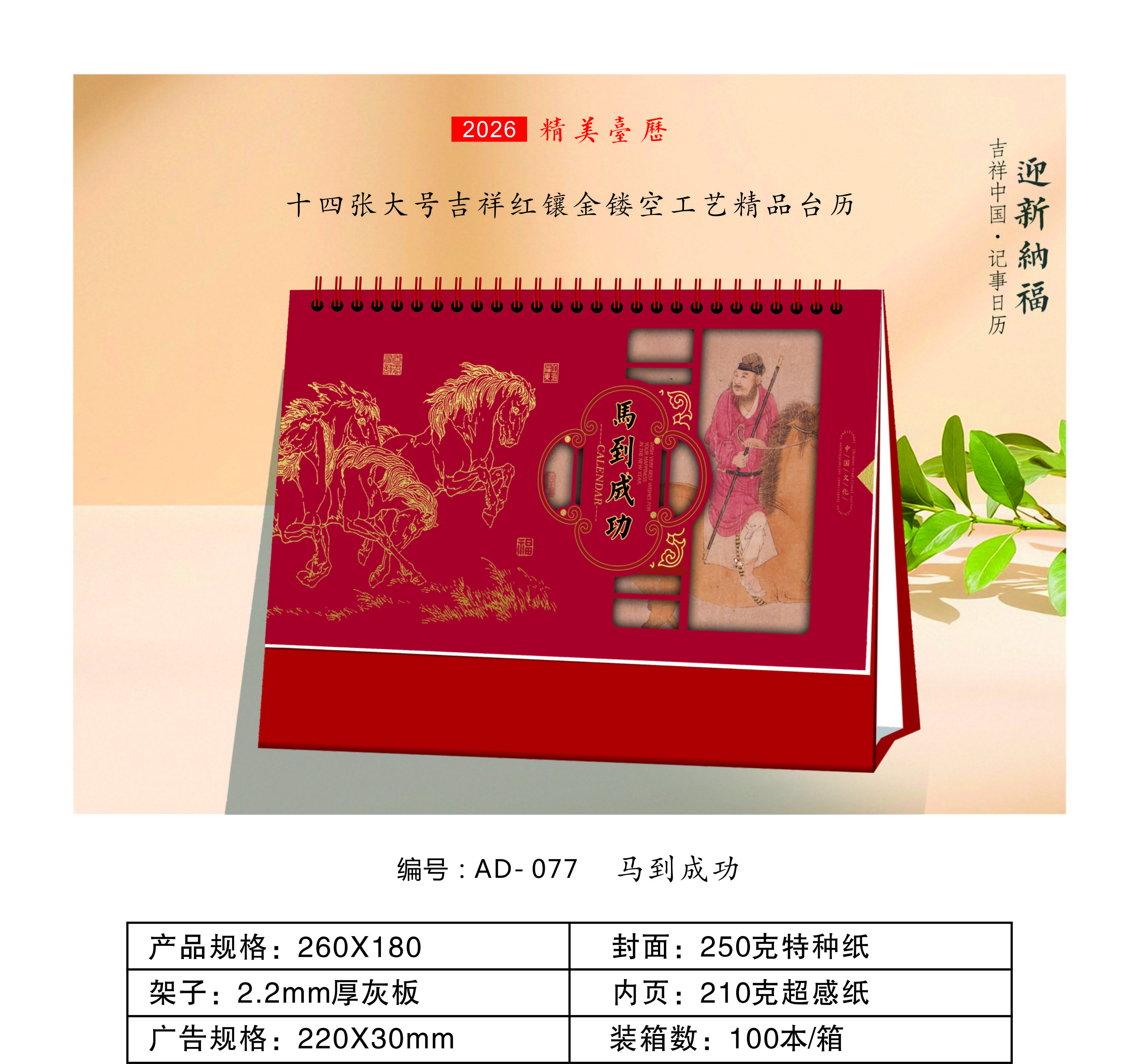 十四张大号吉祥红镶金镂空工艺精品台历-马到成功