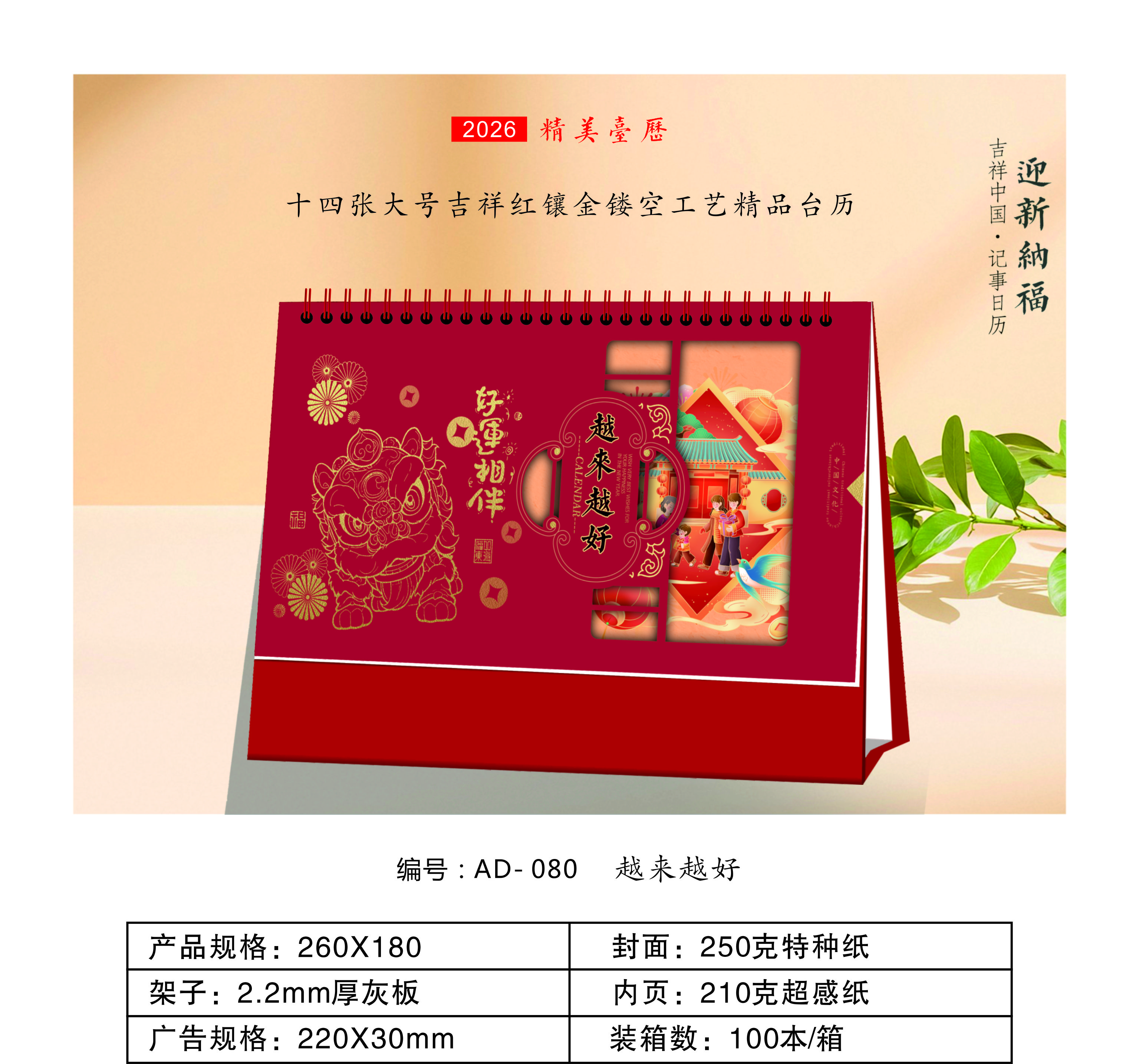 十四张大号吉祥红镶金镂空工艺精品台历-越来越好