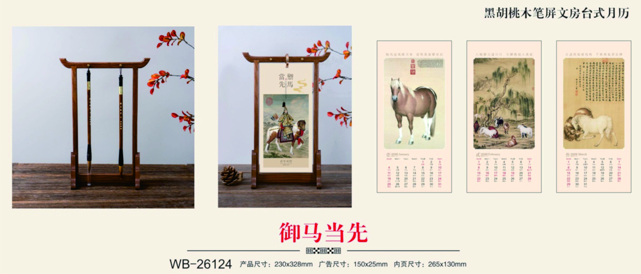 黑胡桃木笔屏文房台式月历-御马当先