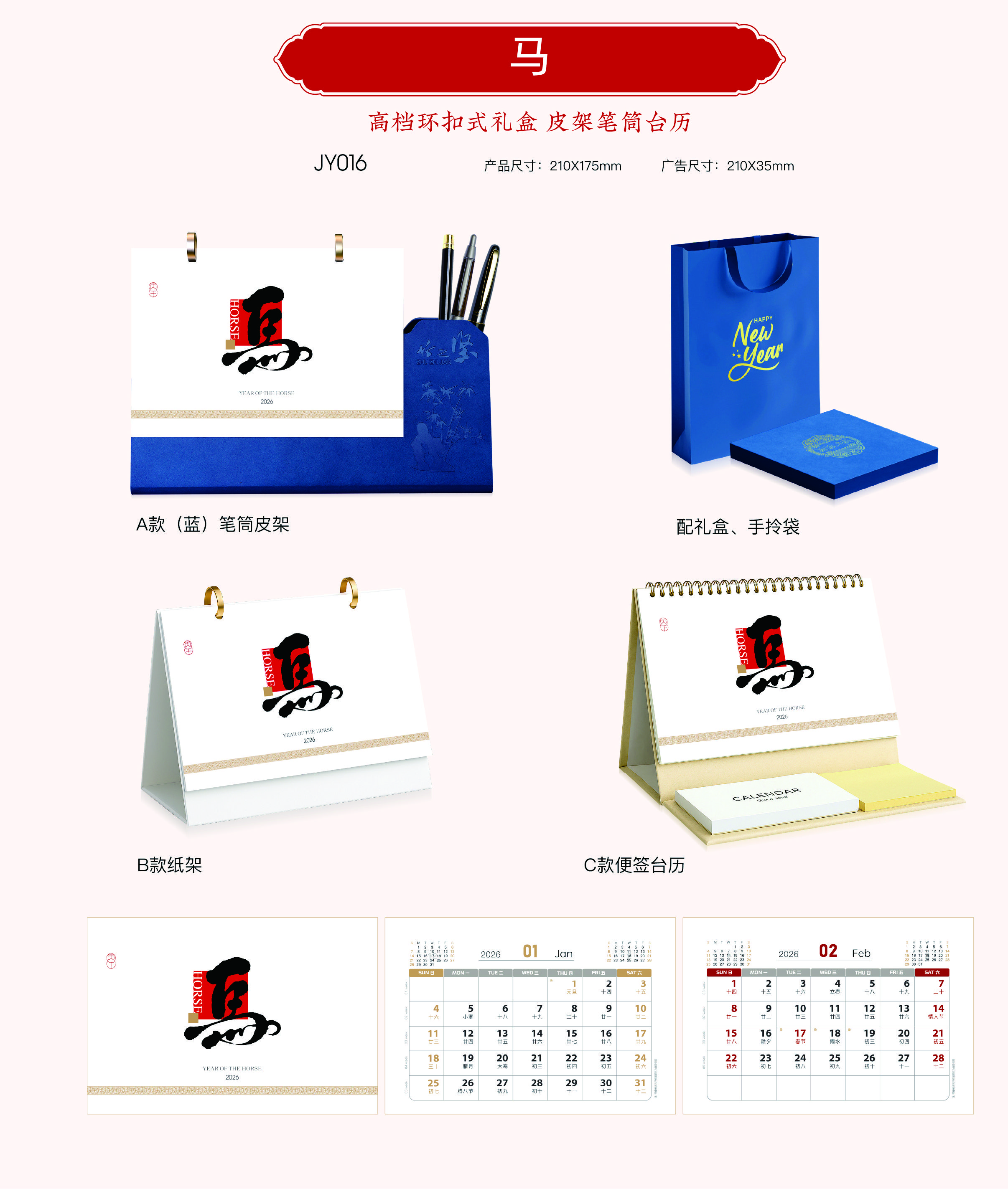 高档环扣式礼盒17张皮架笔筒台历 -马