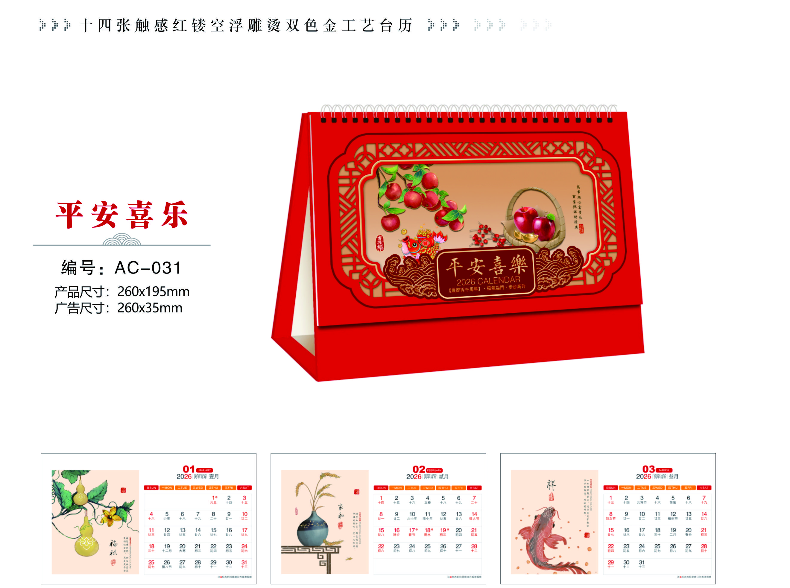 十四张触感红镂空浮雕烫双色金工艺台历-平安喜乐