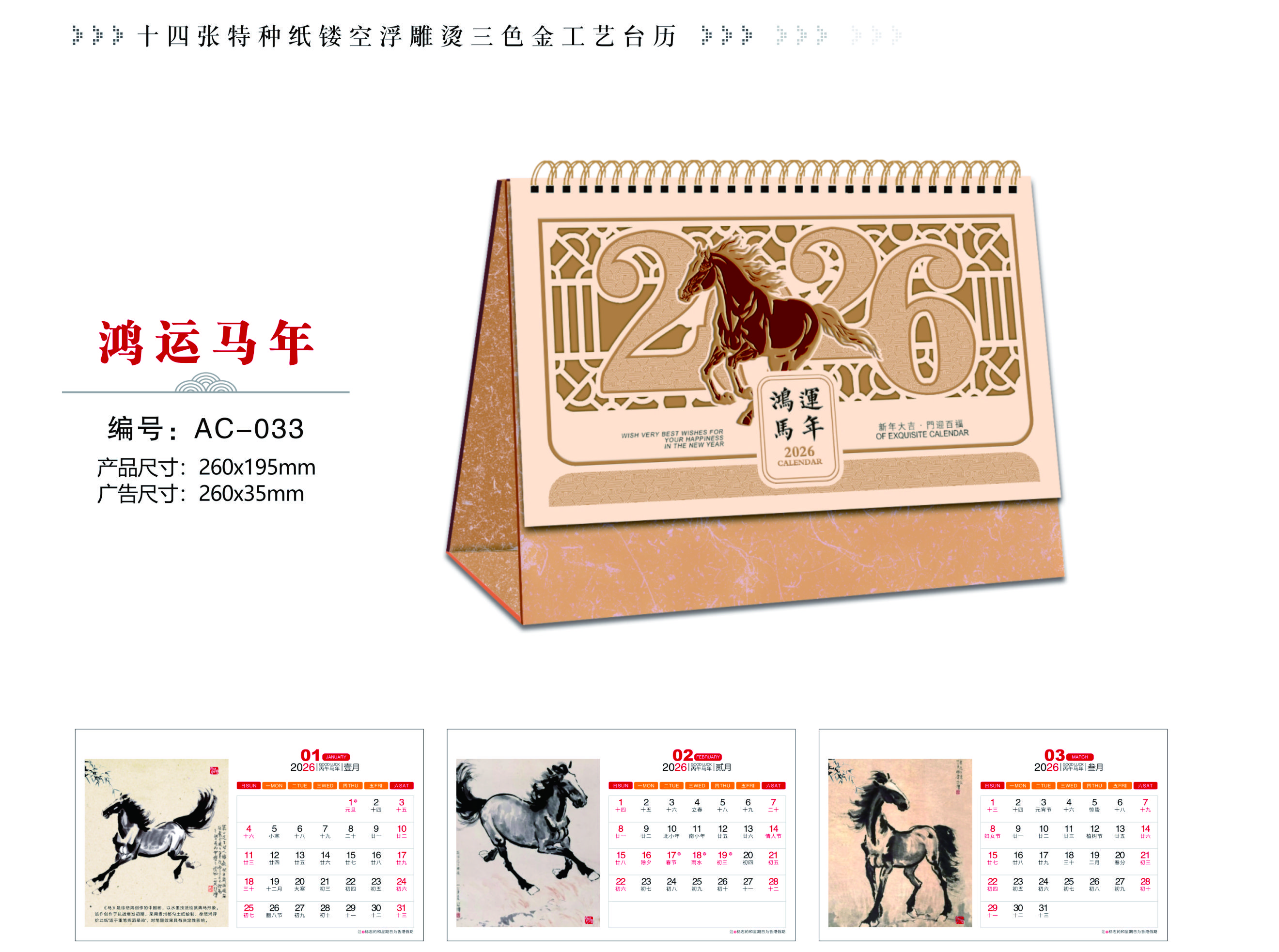 十四张特种纸镂空浮雕烫三色金工艺台历-鸿运马年