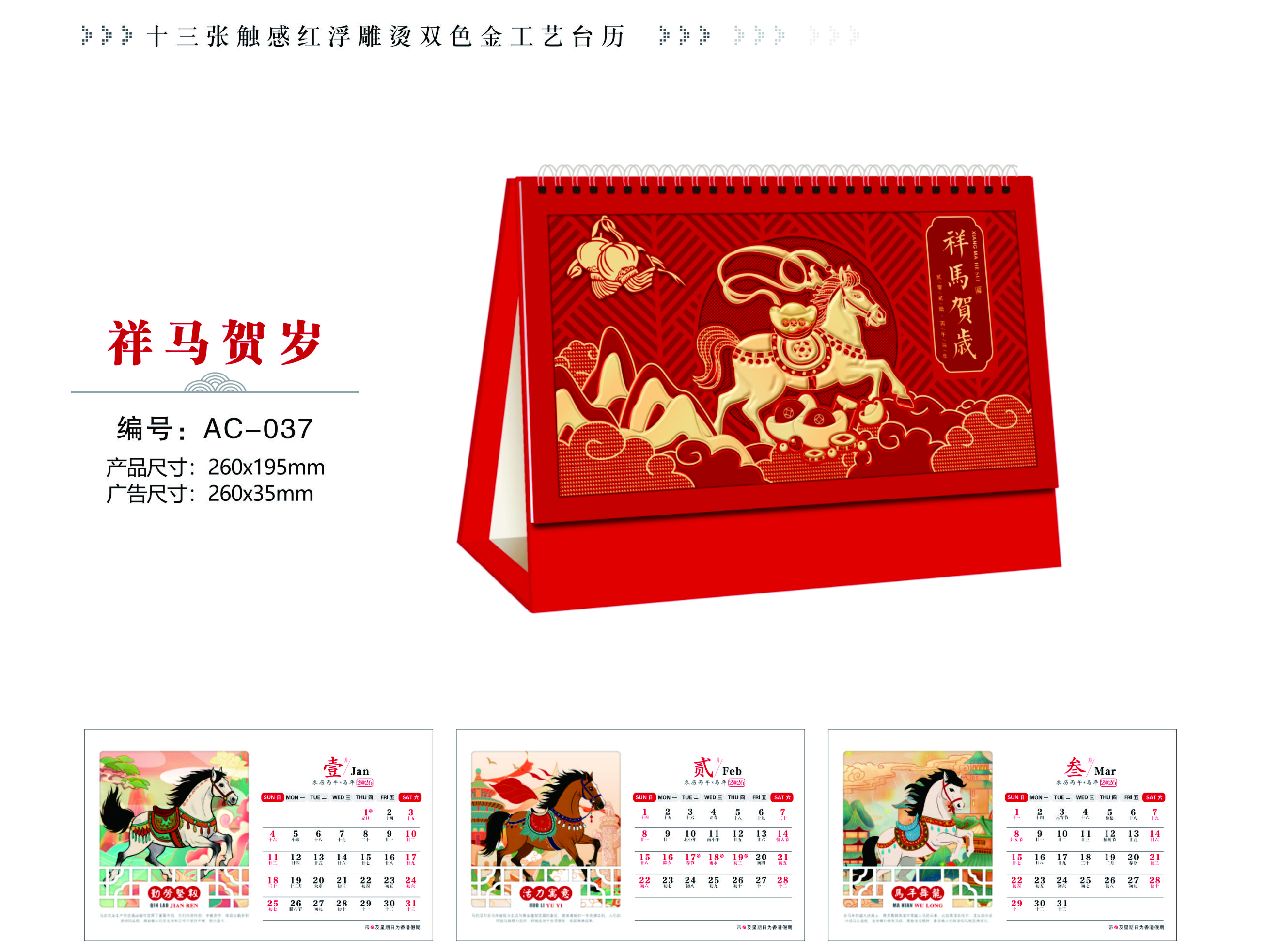 十三张触感红浮雕烫双色金工艺台历-祥马贺岁