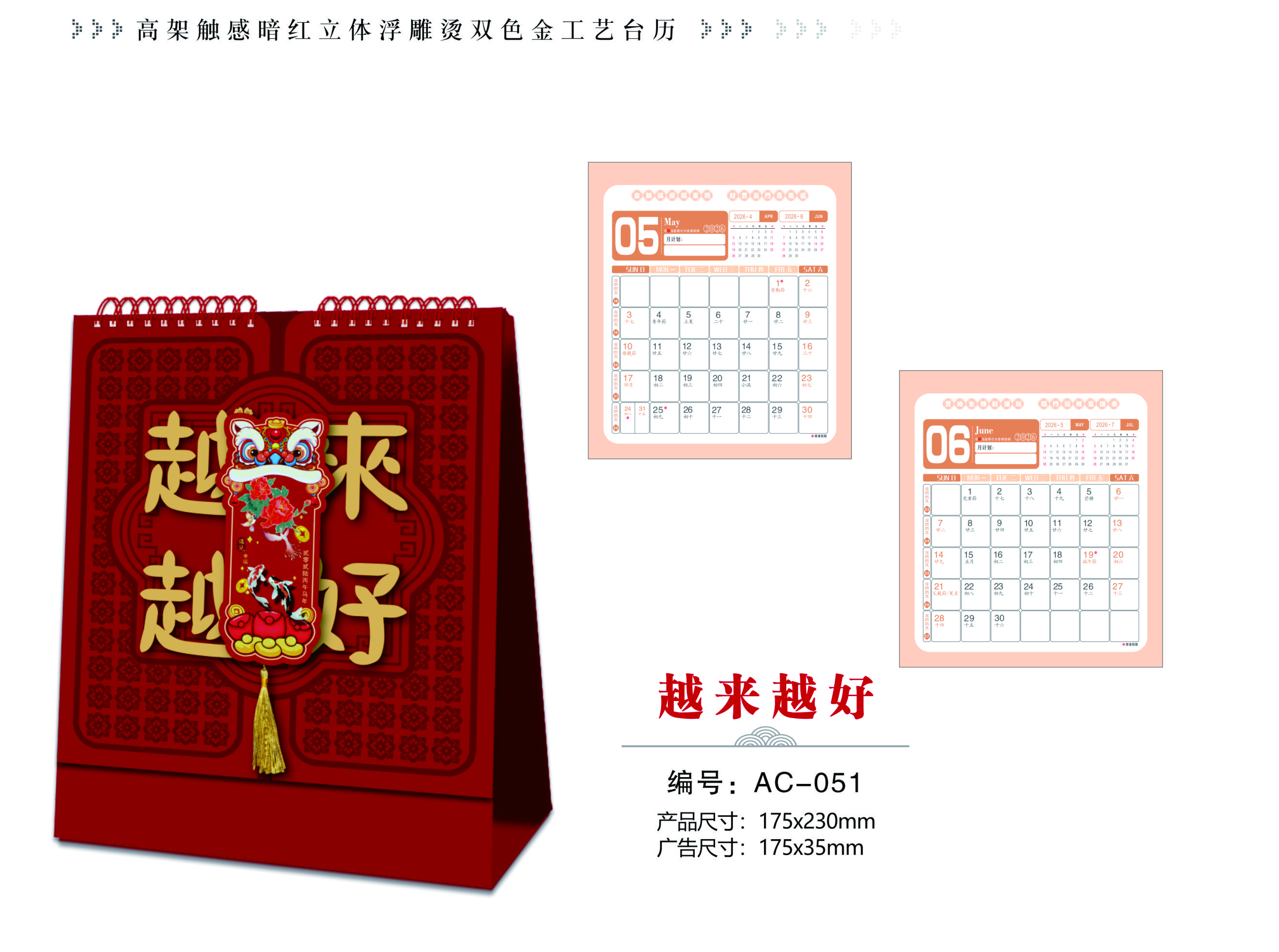 高架触感暗红立体浮雕烫双色金工艺台历-越来越好