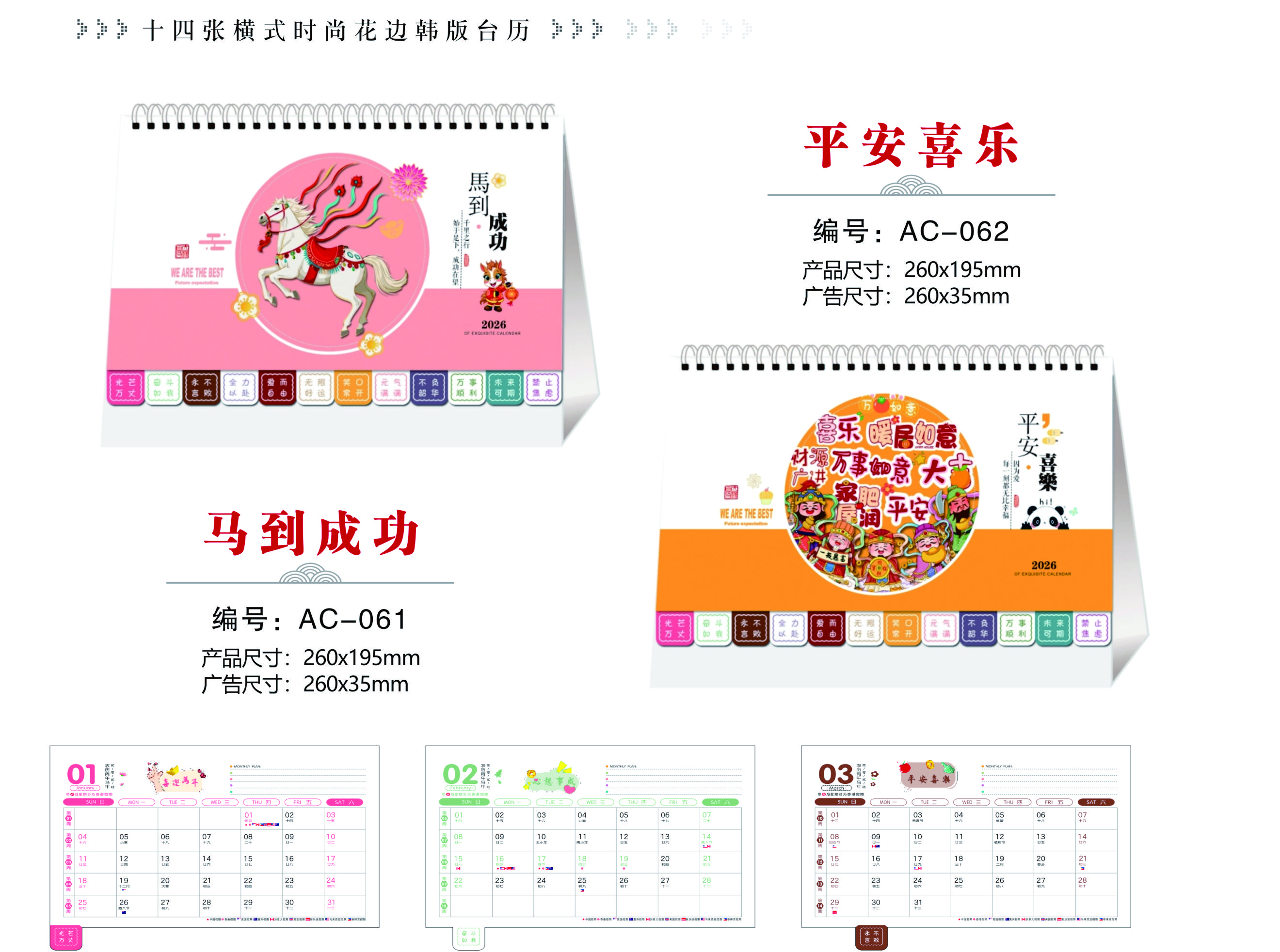 十四张横式时尚花边韩版台历-马到成功
