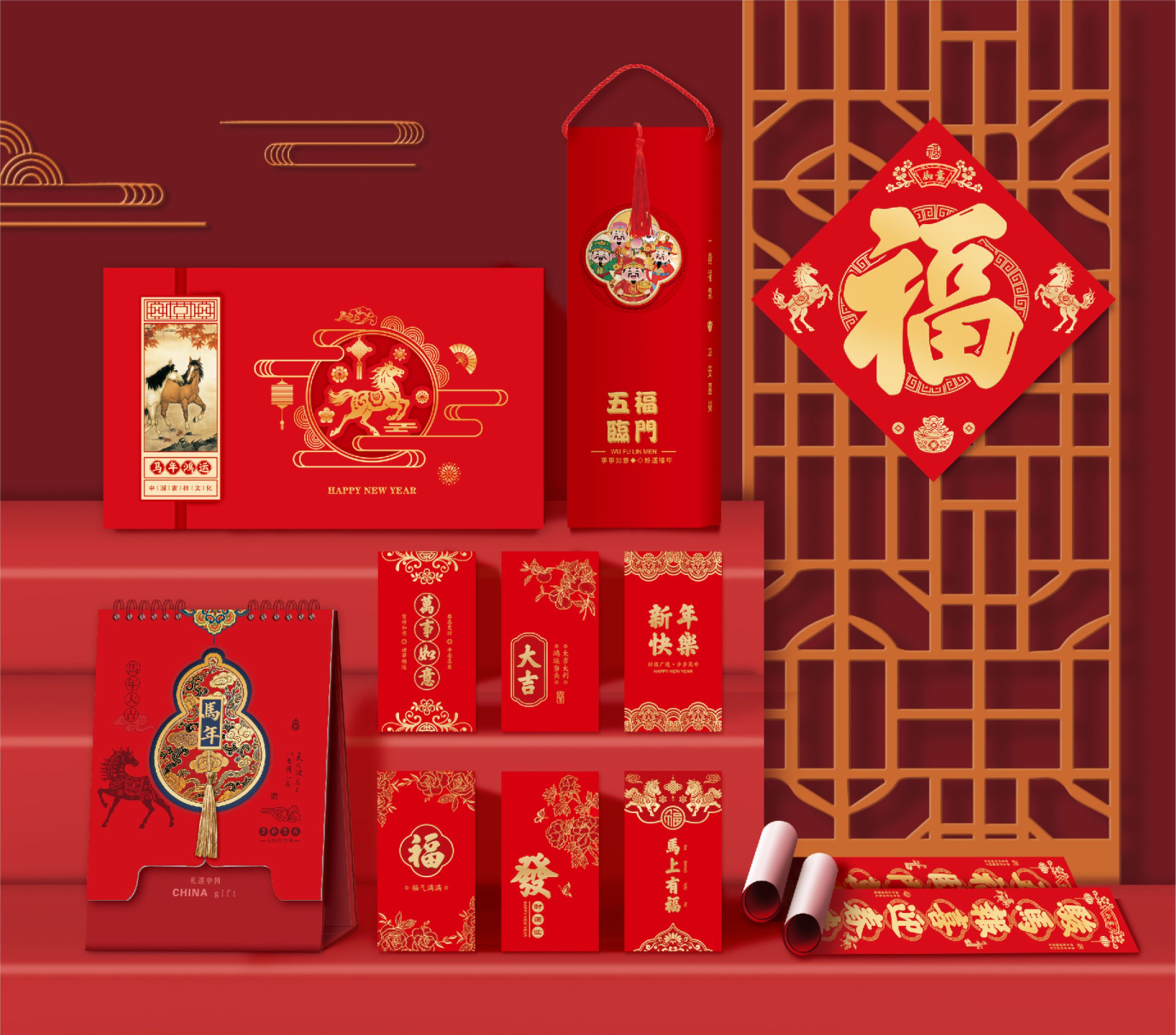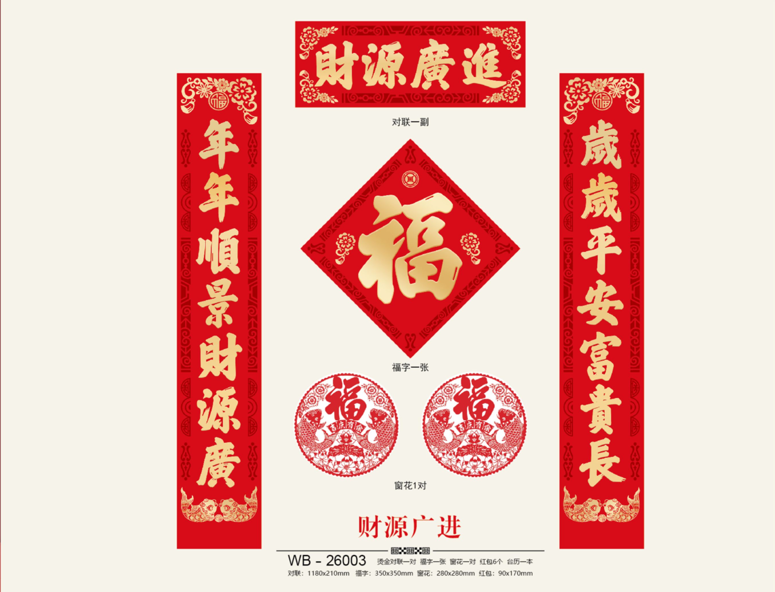 烫金对联一对,福字一张,窗花一对,红包6个,台历一本 对联:1180×210mm 福字:350×350mm