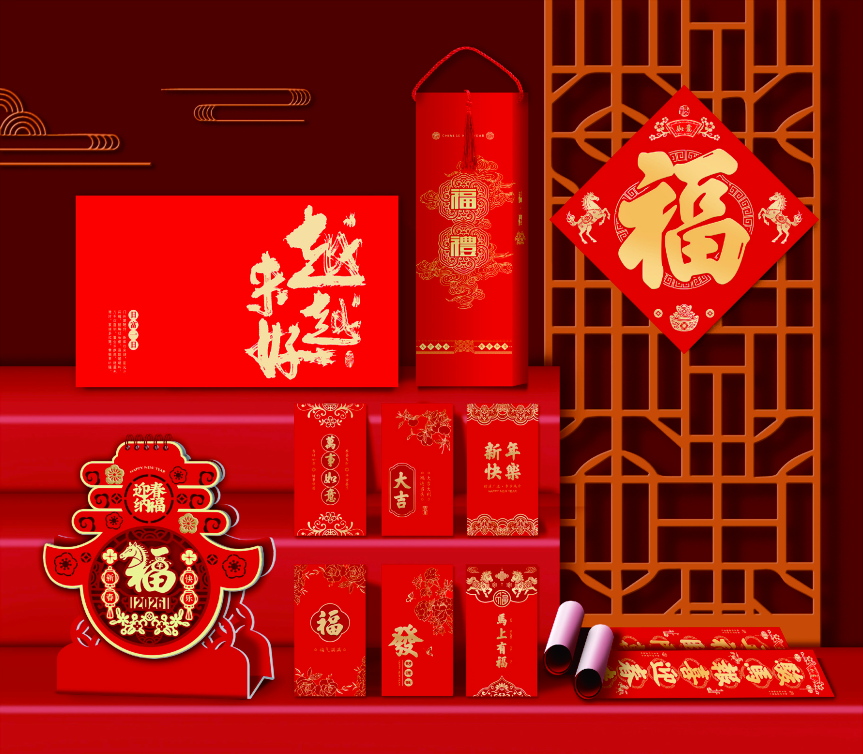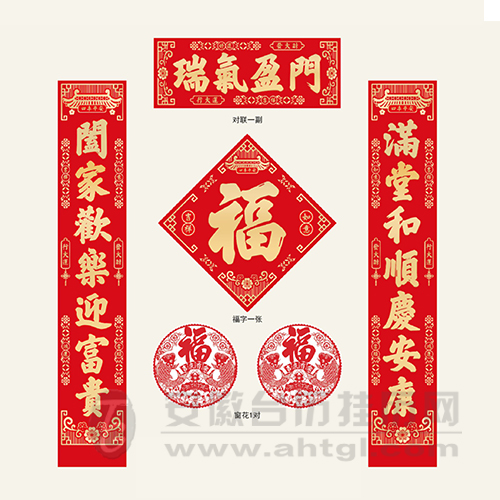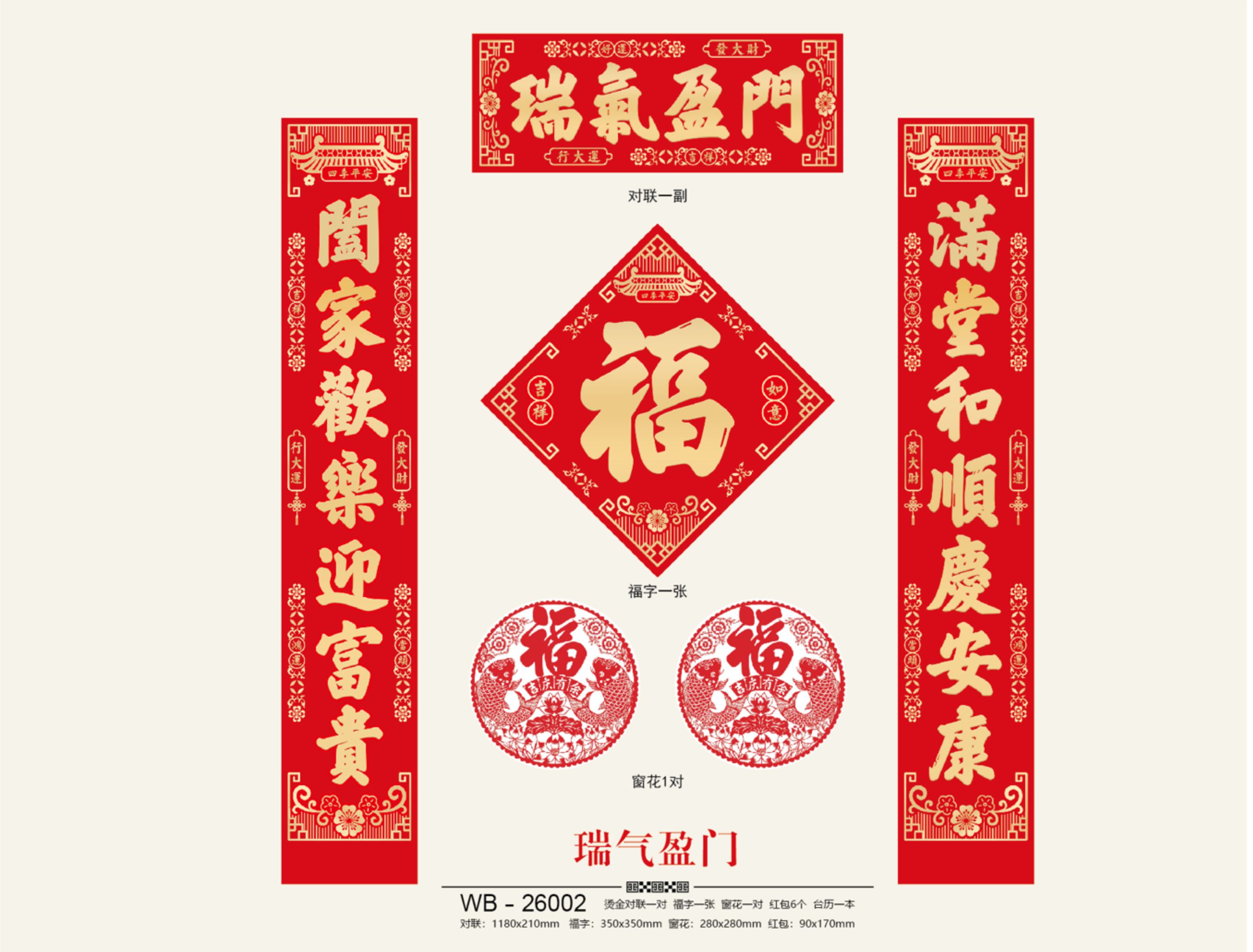 烫金对联一对,福字一张,窗花一对,红包6个,台历一本 对联:1180x210mm 福字:350x350mm
