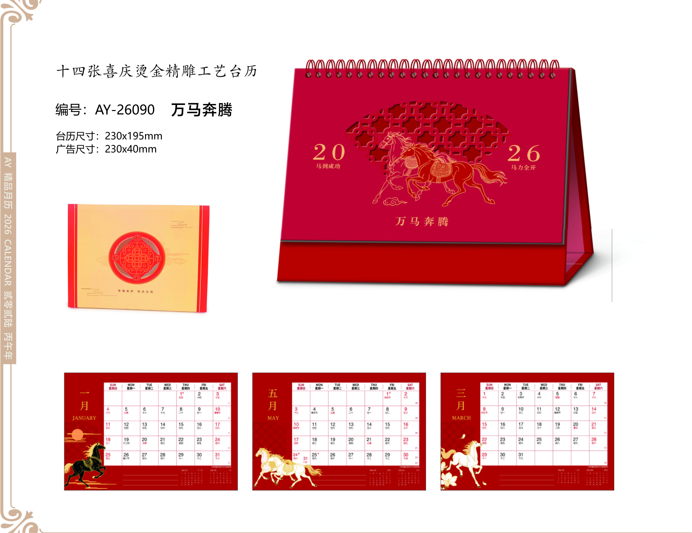 十四张喜庆烫金精雕工艺台历- 万马奔腾